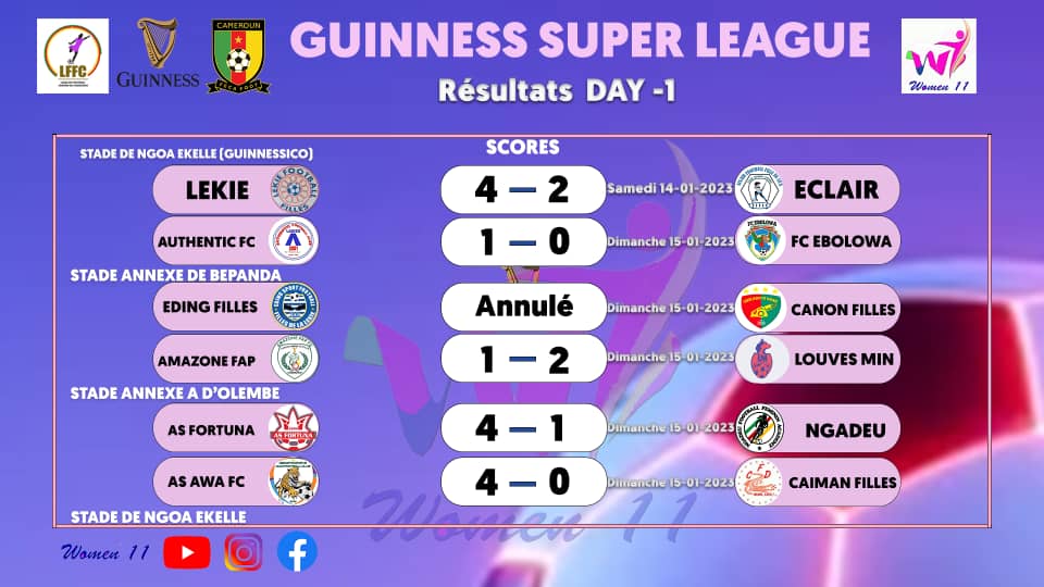 Caïman Fille de Douala à subi le même face mais avec 3 buts de plus face à une équipe d’ Awa FC bien en place. Les gagnates de la saison dernière n’ont laissé aucun rebond à leurs adversaires. Fin de la partie 4-0. Les buteuses sont Guylaine Tchadeu (23′, 62′, 80′) et Madeleine Darbawa (73′). Les résultats de cette journée ci-bas :