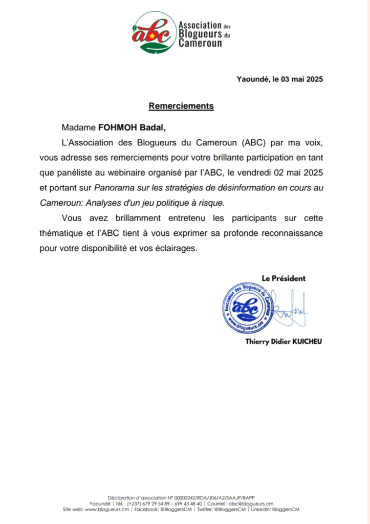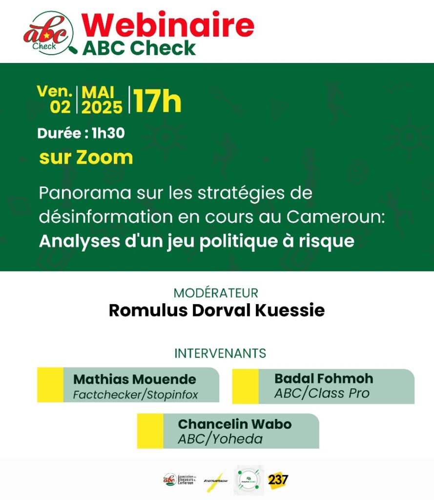 Tu sais, il y a des invitations qui ne laissent pas indifférente. En tant que membre active et prolifique de l’Association des Blogueurs du Cameroun, et faisant partie de la commission fact-cheking, nous avons entrepris sous la coordination de Donald Tchiengue, de mettre sur pied une plateforme qui nous est propre. Et sur laquelle nous travaillerons à lutter contre la désinformation et les discours de haine. Pour la première activité, j’ai été conviée à intervenir, vendredi dernier, lors du webinaire sur le thème: « Panorama sur les stratégies de désinformation en cours au Cameroun : un jeu politique à risque ».
